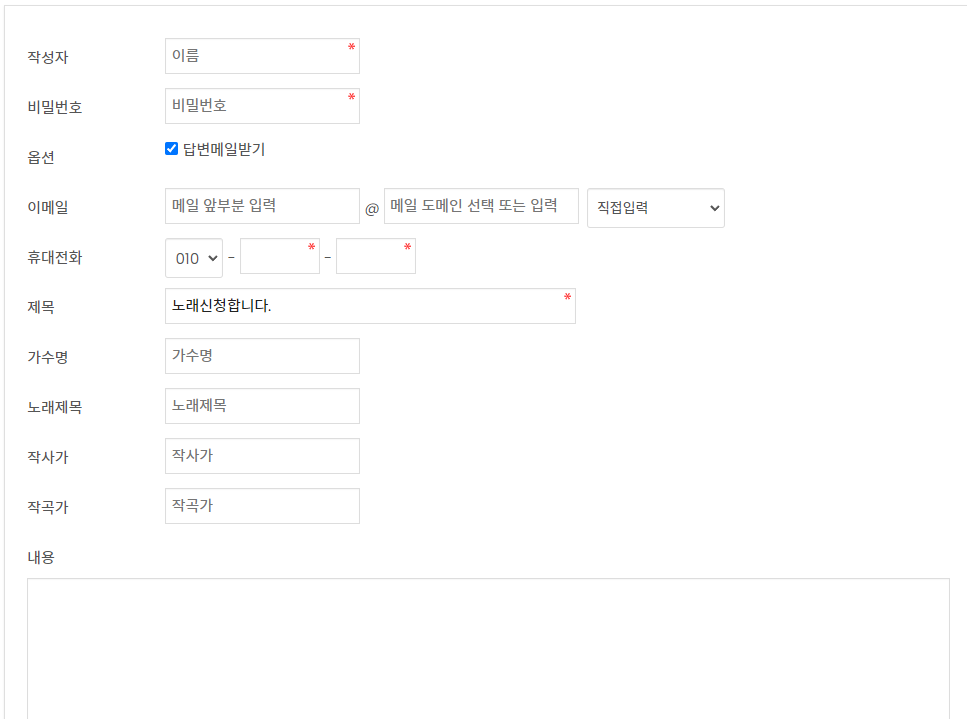 작성 양식에 따라 작성자 이름, 비밀번호, 이메일, 휴대전화 번호, 제목, 가수명, 노래제목, 작사가, 작곡가, 내용을