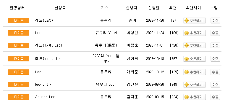 이렇게 많이 신청된 곡은 개별로 또 신청하는 거보다 이미 신청한 곡에 추천수를 높이는 것이
