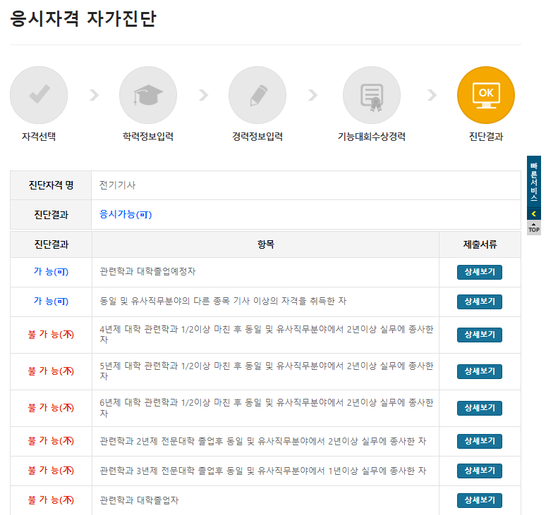 진단결과 저는 4년제 대학 화학과를 졸업해서 전기기사 응시가능으로 나왔습니다.