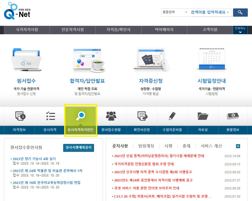 홈페이지에 접속하셨다면 가운데 메뉴 중 돋보기 모양의 응시자격자가진단 메뉴를 클릭해 줍니다. (노란색 박스)